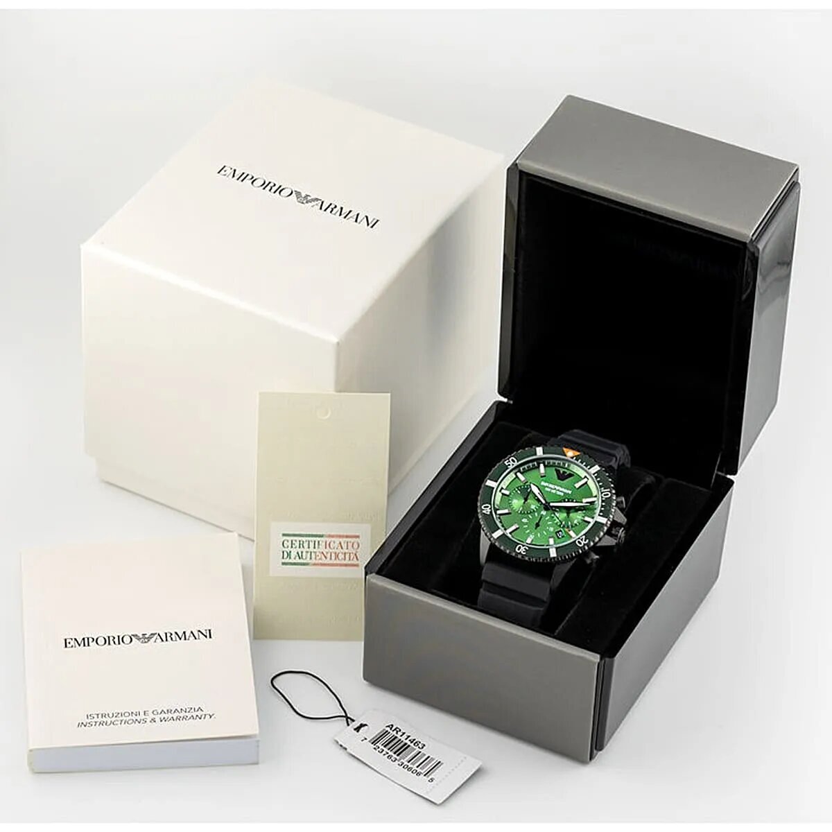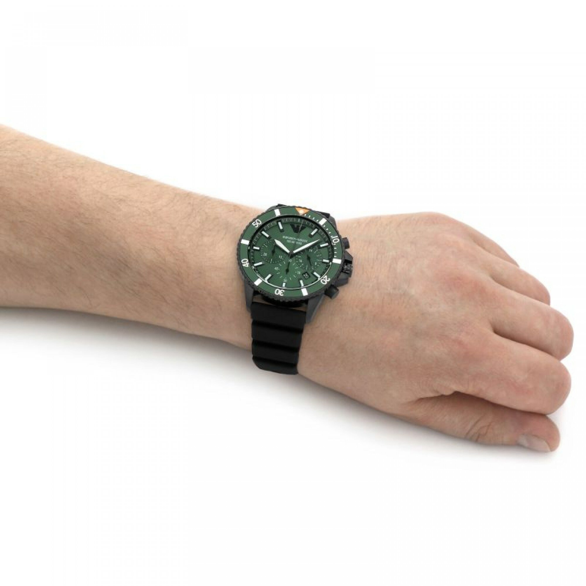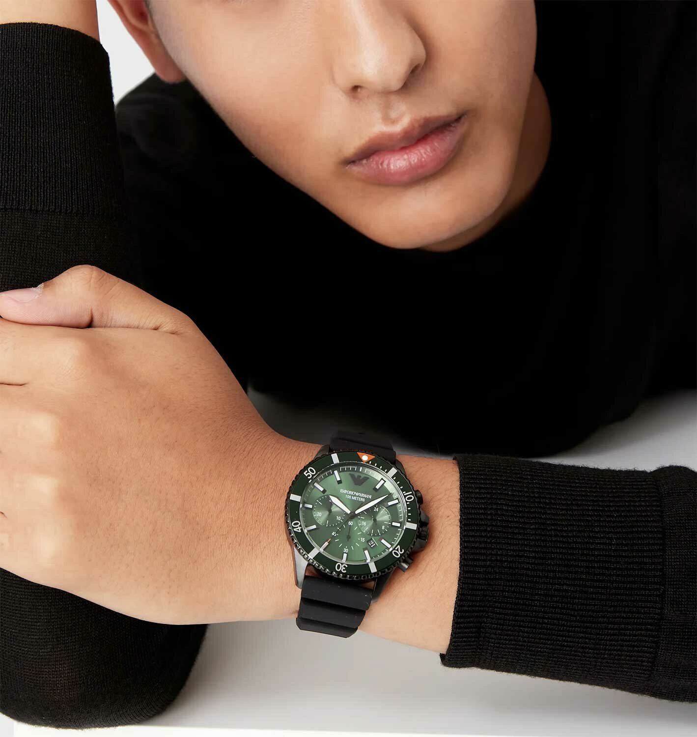 Часы EMPORIO ARMANI Diver AR11463 имеют стильный черный корпус с зеленым циферблатом и минеральное стекло. Они оснащены кварцевым механизмом, который обеспечивает точность хода до 1.0.