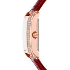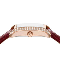 Часы выполнены в элегантном бордовом цвете с золотистыми и белыми акцентами, что делает их ярким и запоминающимся аксессуаром. Корпус и браслет изготовлены из нержавеющей стали с PVD-покрытием, что обеспечивает прочность и долговечность изделия.