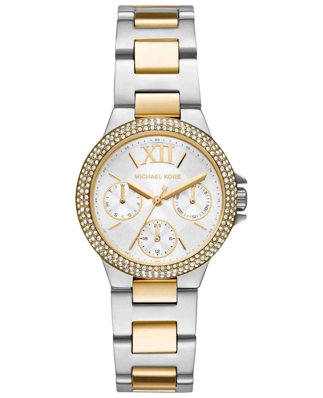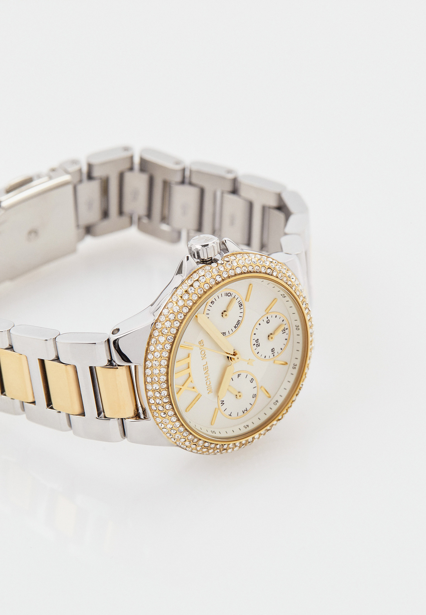 Модель MK6982 оснащена 12-ти и 24-х часовым форматом времени, число и день недели отображаются на отдельных циферблатах. Метки в виде штрихов делают чтение времени удобным и понятным.