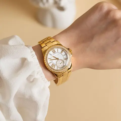 Корпус и перламутровый циферблат украшены кристаллами, что придает часам чарующую силу и позволяет создать неповторимый образ. Метки в виде штрихов и римских цифр делают чтение времени удобным и понятным.